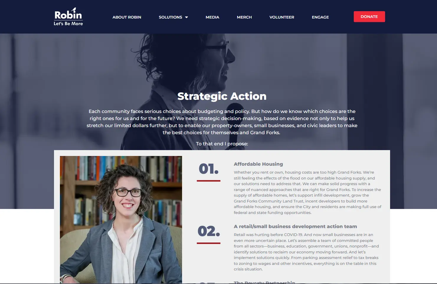 Robin David embarked on a journey to become the Mayor of Grand Forks, North Dakota, and chose us to bring her vision to the digital forefront. Tasked with a swift turnaround, we crafted a sleek and engaging website that not only highlighted her campaign ideals but also captured her vibrant personality, connecting her with the community. Beyond the aesthetics, we implemented a robust donation management system and established a streamlined process for mobilizing campaign volunteers. Our team is thrilled to have played a role in Robin’s campaign, contributing to a platform that inspires and rallies support.
